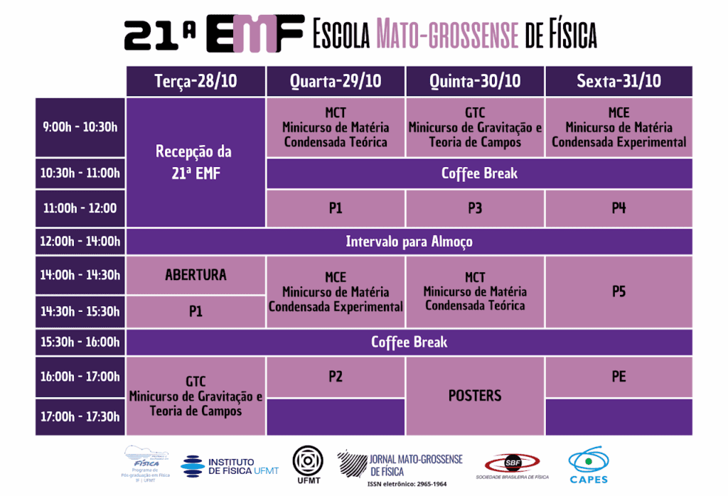 Encontram-se abertas as inscrições para a 21ª Escola Mato-Grossense de Física promovida pelo Programa de Pós-Graduação em Física da UFMT – campus Cuiabá. A 21ª Escola ocorrerá entre os dias 28 e 31 de outubro de 2023. Ao longo desses quatro dias, serão oferecidos aos participantes minicursos e palestras nas mais variadas áreas da Física. A Escola Mato-grossense é um evento tradicional na área de Física, realizado anualmente, caracterizando-se como um importante evento científico, agregando potencialmente a comunidade de físicos e estudantes de Física de Mato Grosso e estados vizinhos, além de renomados pesquisadores nacionais e internacionais.