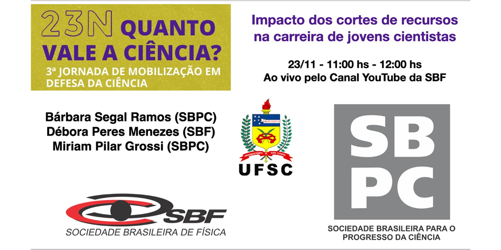 A SBF participou da 3ª Jornada de Mobilização em Defesa da Ciência com o painel “Impacto dos cortes de recursos na carreira dos jovens cientistas”.