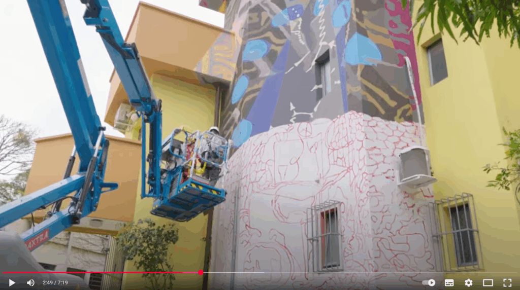 A artista, que também é musicista e poeta, fez questão de visitar laboratórios do IFUSP antes de iniciar a pintura. “A gente visitou laboratórios de laser, de ótica, de plasma, de semicondutores, de criogenia. O bacana é que, olhando a arte final, a gente consegue ver algumas das coisas que foram vistas naqueles momentos ilustradas aqui”, diz Dalpian, no minidocumentário.