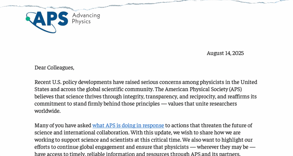 A APS afirma que já foram enviadas mais de 600 cartas ao Congresso pedindo que mudanças nas políticas de vistos sejam feitas de forma cuidadosa, com espaço para discussão pública e participação. “Ao mesmo tempo, estamos facilitando a participação global em nossos encontros, tornando mais fácil para cientistas de todo o mundo se conectarem a seus colegas. Continuaremos dialogando com legisladores sobre o valor de estudantes e pesquisadores internacionais e os danos causados por medidas excludentes ou punitivas. Nosso objetivo é não apenas proteger os direitos individuais, mas preservar as oportunidades de mobilidade científica internacional: o sangue vital da descoberta científica. A saúde do empreendimento científico está em jogo.”