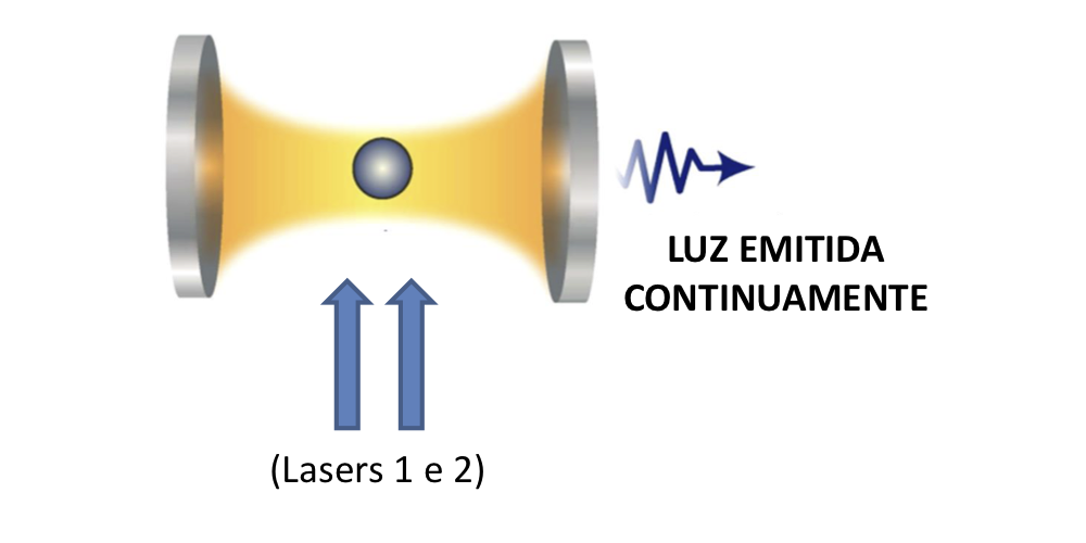 Villas-Boas e colegas do Instituto Max Planck de Óptica Quântica, Alemanha, publicaram em março na Physical Review Letters um estudo teórico de geração de luz por um único átomo aprisionado dentro de uma cavidade óptica. A cavidade óptica consiste de dois espelhos com coeficiente de reflexão muito alto, fazendo com que a luz seja refletida inúmeras vezes e o átomo dentro da cavidade interaja fortemente com o campo eletromagnético. Os pesquisadores mostram como ajustar dois feixes laser externos de modo a produzir uma interferência quântica destrutiva entre os processos de absorção, e uma interação entre os estados fundamentais que induzem a cavidade a emitir fótons, sem que o átomo dentro dela possa alcançar um estado excitado.