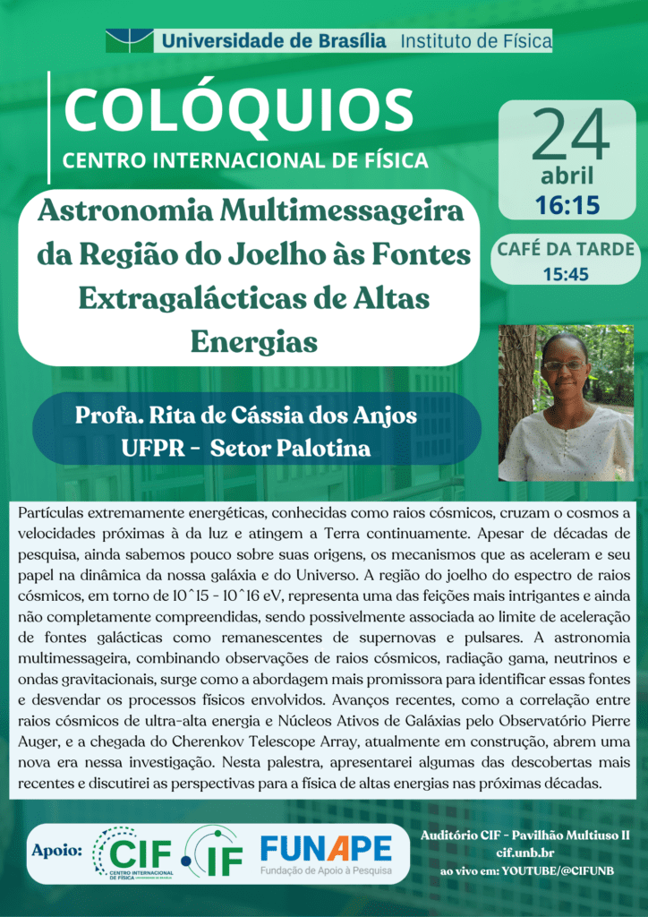 Resumo: Partículas extremamente energéticas, conhecidas como raios cósmicos, cruzam o cosmos a velocidades próximas à da luz e atingem a Terra continuamente. Apesar de décadas de pesquisa, ainda sabemos pouco sobre suas origens, os mecanismos que as aceleram e seu papel na dinâmica da nossa galáxia e do Universo. A região do joelho do espectro de raios cósmicos, em torno de 10^15 – 10^16 eV, representa uma das feições mais intrigantes e ainda não completamente compreendidas, sendo possivelmente associada ao limite de aceleração de fontes galácticas como remanescentes de supernovas e pulsares. A astronomia multimessageira, combinando observações de raios cósmicos, radiação gama, neutrinos e ondas gravitacionais, surge como a abordagem mais promissora para identificar essas fontes e desvendar os processos físicos envolvidos. Avanços recentes, como a correlação entre raios cósmicos de ultra-alta energia e Núcleos Ativos de Galáxias pelo Observatório Pierre Auger, e a chegada do Cherenkov Telescope Array, atualmente em construção, abrem uma nova era nessa investigação. Nesta palestra, apresentarei algumas das descobertas mais recentes e discutirei as perspectivas para a física de altas energias nas próximas décadas.