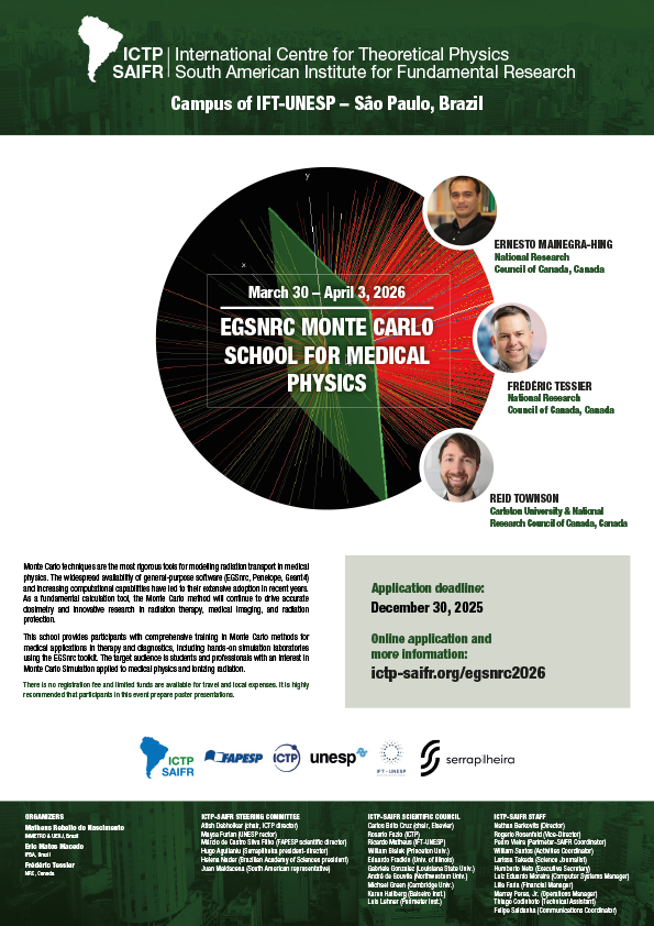 Voltado para pesquisadores e profissionais da Física Médica e metrologia das radiações ionizantes, o evento será realizado de 30/3 a 3/4 de 2026, no Instituto de Física Teórica da Universidade do Estado de São Paulo (Unesp). As inscrições podem ser feitas pelo endereço ictp-saifr.org/egsnrc2026 até 30 de dezembro deste ano.
