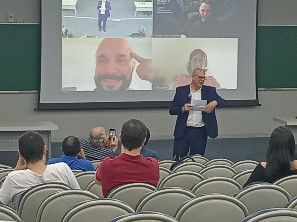 Quem iniciou a cerimônia foi Kaline Coutinho, atual diretora do IFUSP e primeira mulher a ocupar o cargo, que é também companheira de Canuto. Em certo momento, ela se emocionou com a recordação sobre como eles se conheceram, das pesquisas que fizeram e da família que construíram. Emocionante também foi a apresentação de Adalberto Fazzio, diretor da Ilum Escola de Ciência do CNPEM e Professor Titular da USP, sobre a amizade de longa data com Canuto, lembrando de 1974 quando, demitidos da Universidade de Brasília (UnB), empreenderam uma viagem longa até São Paulo em busca de trabalho. “Fomos para São Carlos e também não deu certo: o pessoal ficou assustado com o tamanho do cabelo do Sylvio e com o meu cabelo também. ‘Pô, mas vocês são hippies’.”, lembra Fazzio.