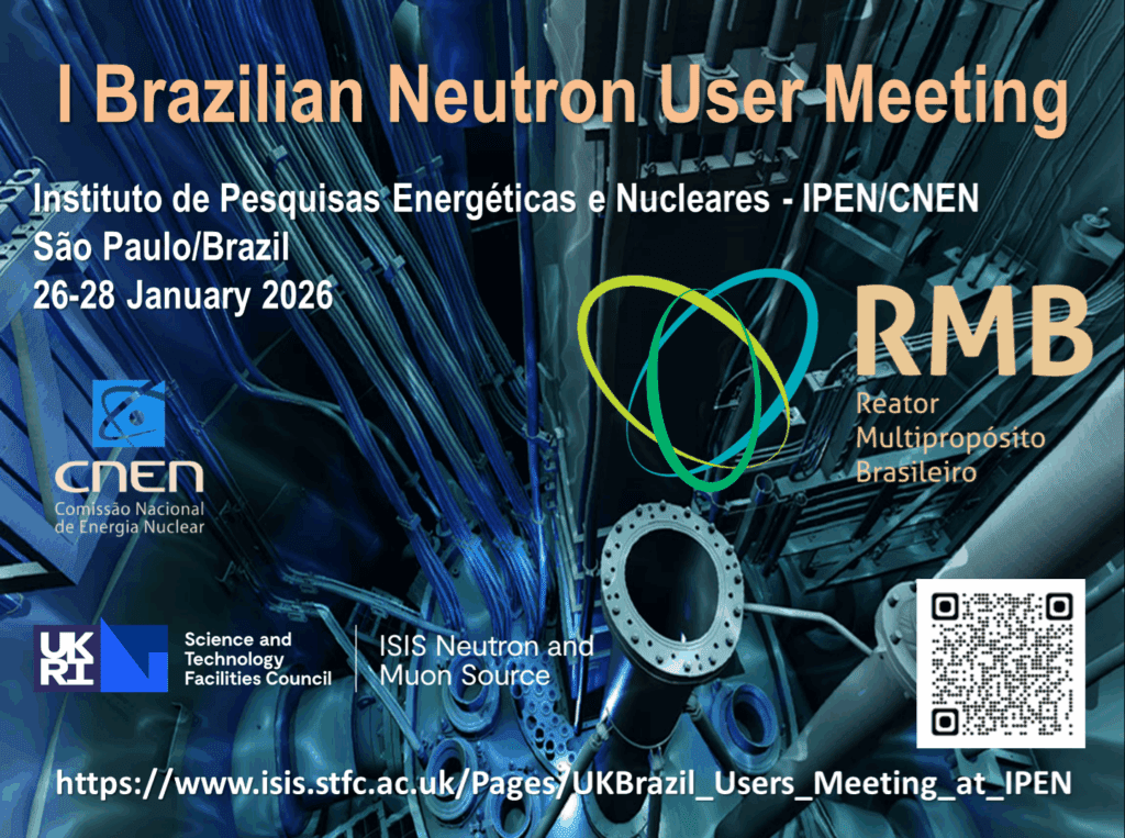 I Reunião de Usuários de Nêutrons (I RUN) do Brasil, a ser realizada no Instituto de Pesquisas Energéticas e Nucleares – IPEN, São Paulo – SP, nos dias 26, 27 e 28 de Janeiro de 2026. A iniciativa conta com a participação e apoio do ISIS Neutron and Muon Source – Reino Unido, e tem como objetivo apresentar resultados da parceria com pesquisadores(as) brasileiros(as), estimular novas propostas de colaboração e fomentar discussões entre a comunidade de usuários de nêutrons e a instituição responsável pelo projeto e construção do Reator Multipropósito Brasileiro (RMB), a Comissão Nacional de Energia Nuclear (CNEN). A data limite de inscrição é 20 de dezembro de 2025.