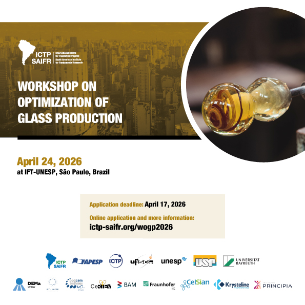 No dia 24 de abril de 2026, o ICTP-SAIFR, em São Paulo, recebe o Workshop sobre Otimização da Produção de Vidro (Optimization of Glass Production), evento internacional dedicado à apresentação e à troca de conhecimentos sobre produção de vidro e estratégias para sua otimização, com foco especial em eficiência energética e produção sustentável.