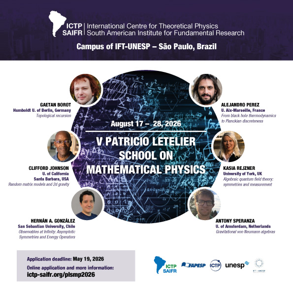 O ICTP-SAIFR realiza, de 17 a 28 de agosto de 2026, a quinta edição da Escola Patricio Letelier de Física Matemática (V Patricio Letelier School on Mathematical Physics). O evento se concentra em avanços recentes no uso de métodos matemáticos formais na teoria quântica de campos e na gravidade, explorando duas áreas-chave – álgebras de operadores e modelos de matrizes – e suas aplicações ao estudo de campos quânticos, gravidade quântica e simetrias generalizadas.