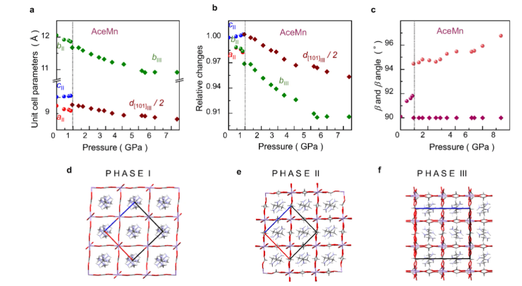 Uma outra observação peculiar foi feita para o material FMDMn, que exibe um comportamento distinto sob pressão. Assim como o AceMn, sua estrutura cristalina é composta por metais ligados ao grupo formiato com “cavidades” centrais que abrigam moléculas orgânicas. No caso do FMDMn, sob pressão, essas cavidades sofrem alterações levando os íons orgânicos a se ordenarem, sem que haja mudança na simetria cristalina, o que também é um fenômeno incomum nestes sistemas.