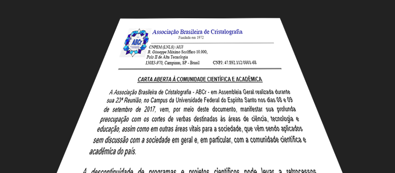 A Sociedade Brasileira de Física recebeu da Associação Brasileira de Cristalografia (ABCr) uma “Carta aberta à comunidade científica e acadêmica, em que a entidade manifesta