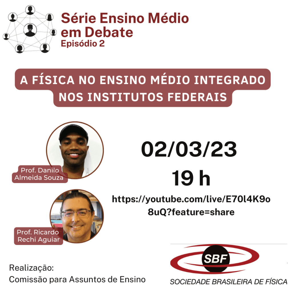 A série Ensino Médio em Debate realizará o episódio 2 no dia 02 de março de 2023 às 19 h. Os convidados para dialogar sobre “A Física no Ensino Médio Integrado nos Institutos Federais” são os professores Danilo Almeida Souza do IFBA (Instituto Federal da Bahia) e Ricardo Rechi Aguiar do IFSP (Instituto Federal de São Paulo).