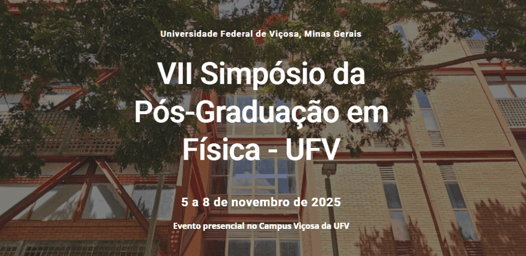 O Departamento de Física da Universidade Federal de Viçosa (UFV) promoverá entre os dias 5 e 8 de novembro de 2025 o VII Simpósio da Pós-graduação em Física – UFV, que ocorrerá de forma presencial no Campus da UFV. O prazo para inscrição foi prorrogado e agora pode ser realizada na página do evento até 27/10. Além disso, a submissão de trabalhos pode ser feita até o dia 22/10/2025