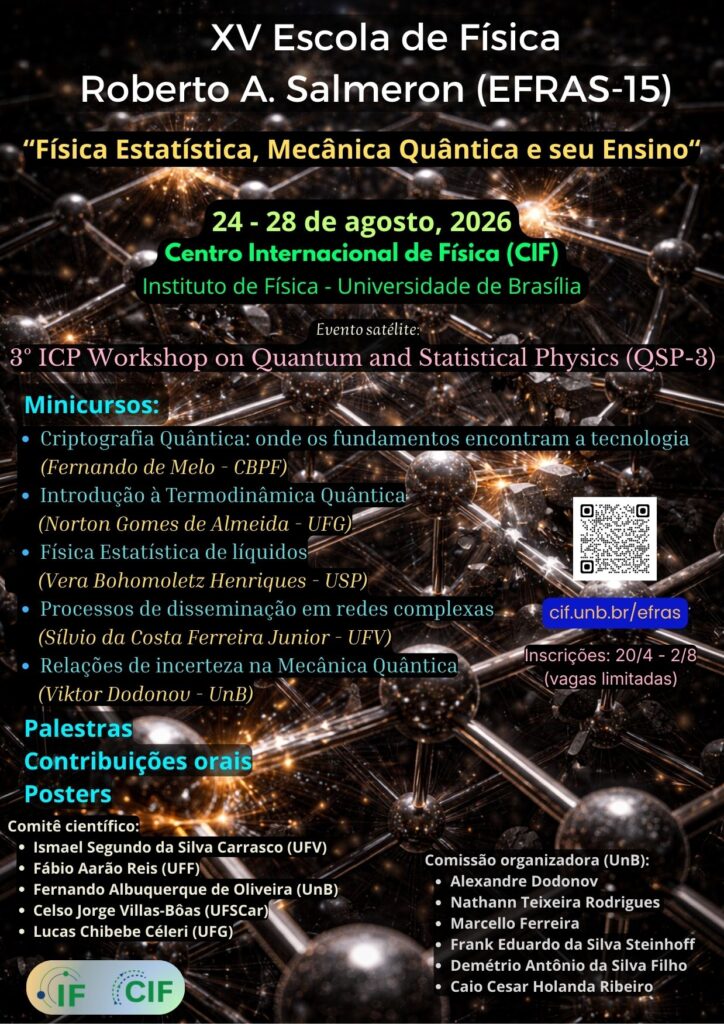 O Centro Internacional de Física (CIF) da Universidade de Brasília (UnB) realizará nos dias 24-28 de agosto de 2026 a 15ª edição de Escola de Física Roberto A. Salmeron (XV EFRAS), com o tema: “Mecânica Estatística, Física Quântica e seu Ensino“.